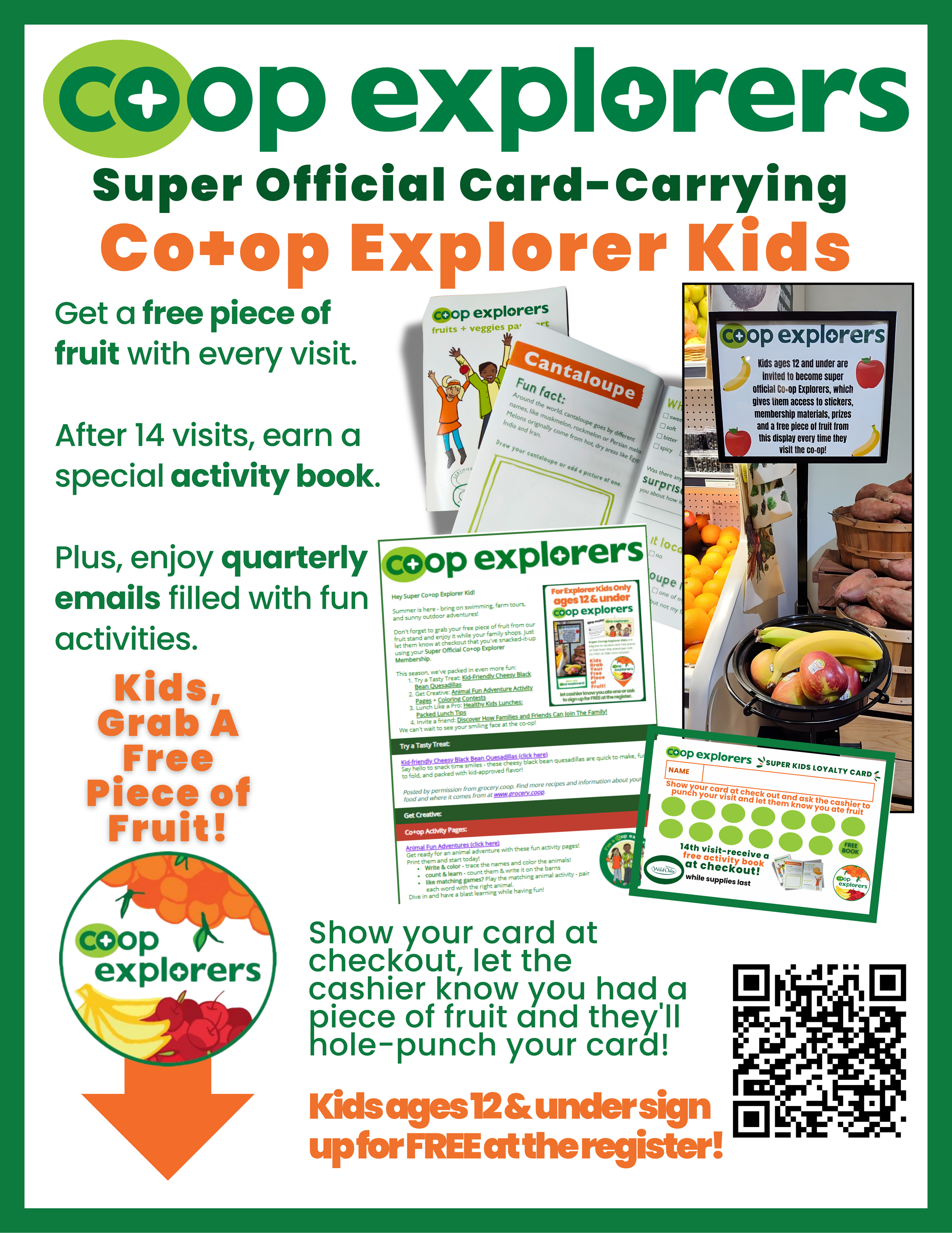 Kids ages 12 and under SIGN UP FOR FREE to get a free piece of fruit per visit, earn an activity book, and receive quarterly activity emails.