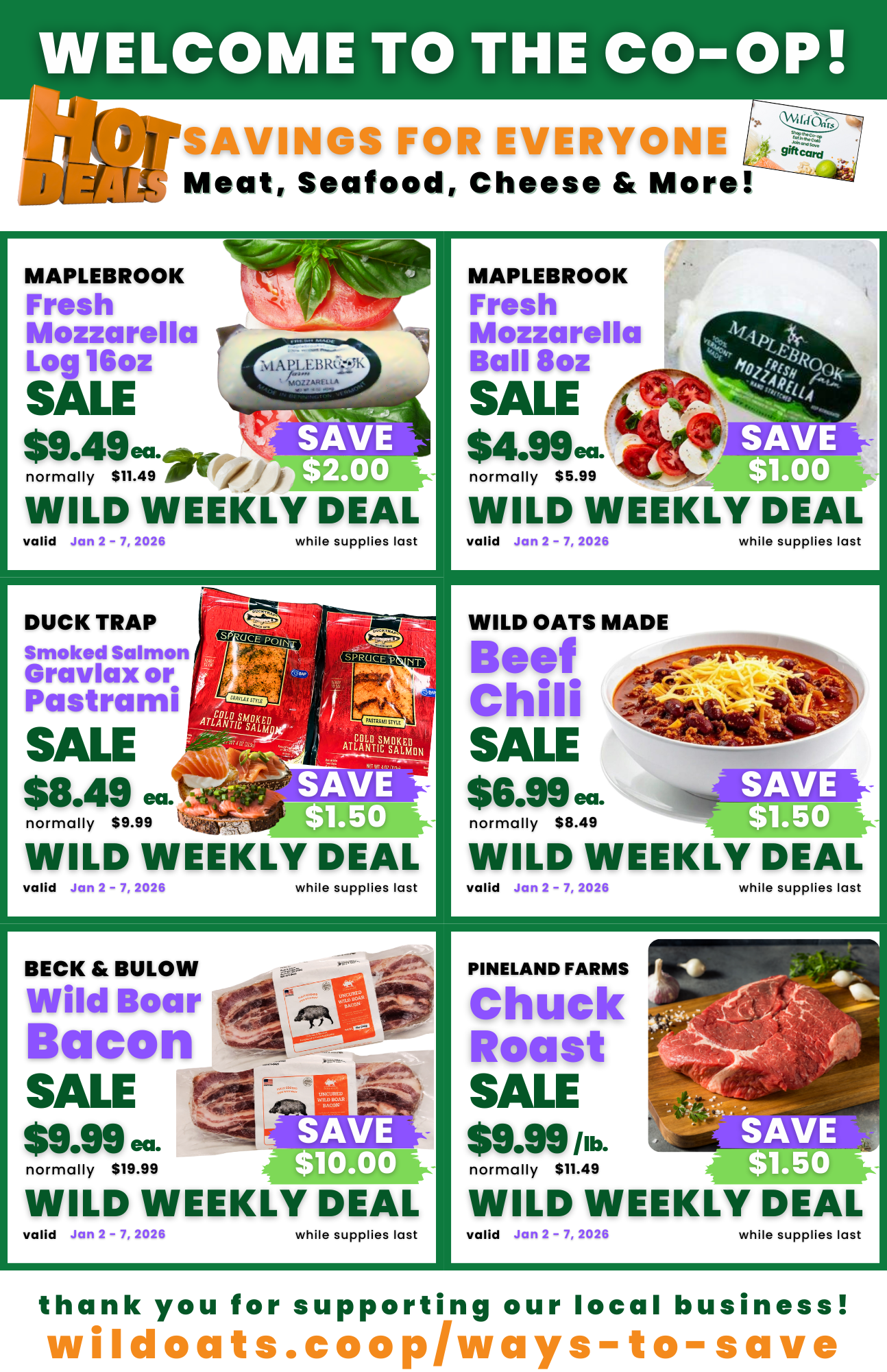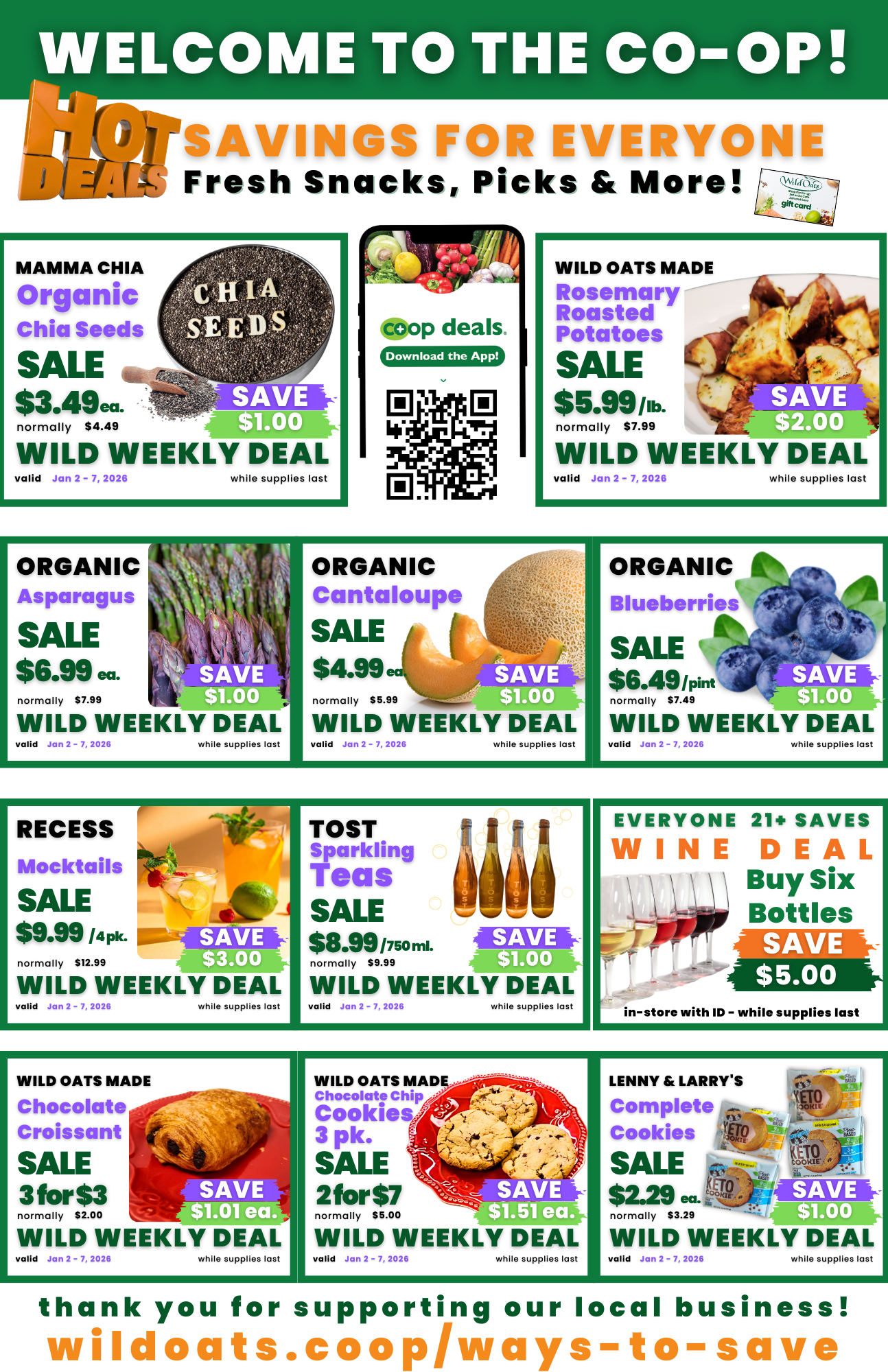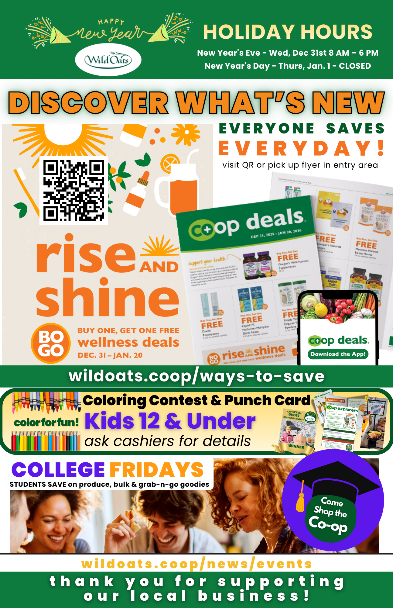 We’re ringing in the year with a burst of savings, including Rise & Shine BOGO buy one, get one FREE wellness deals! You’ll also find fresh Wild Weekly Deals and plenty more good things in this week’s newsletter. And if you're thinking about resolutions, we loved this thoughtful read from grocery.coop: One and Done: The Only New Year's Resolution You'll Ever Need (click here).