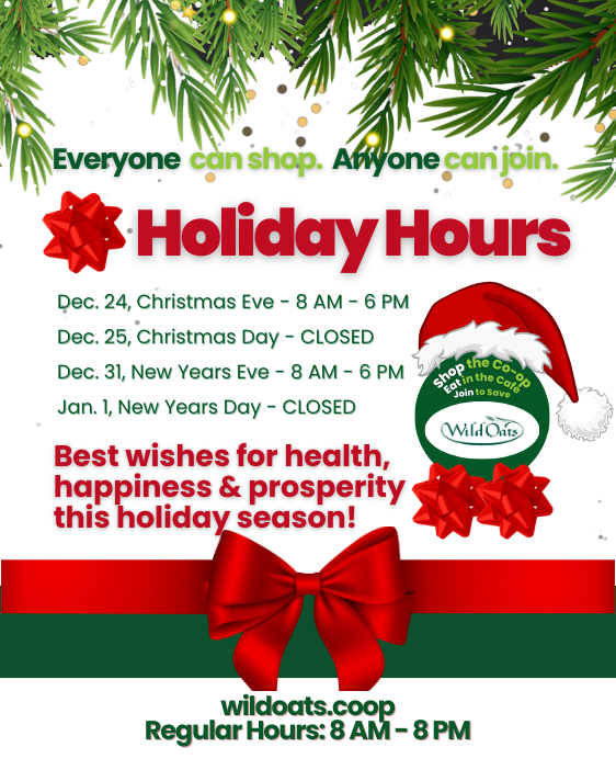 As the holiday season wraps up, we'd like to extend our warmest wishes. However you choose to celebrate, we hope your gatherings are filled with joy, love, and delicious food. Happy Holidays from your family here at Wild Oats Market!