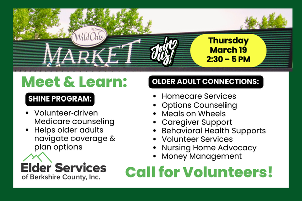 Stop by the Elder Services of Berkshire County table between 2:30-5PM to find out more about how they provide services to our community, and how you can help them support Berkshire County older adults!