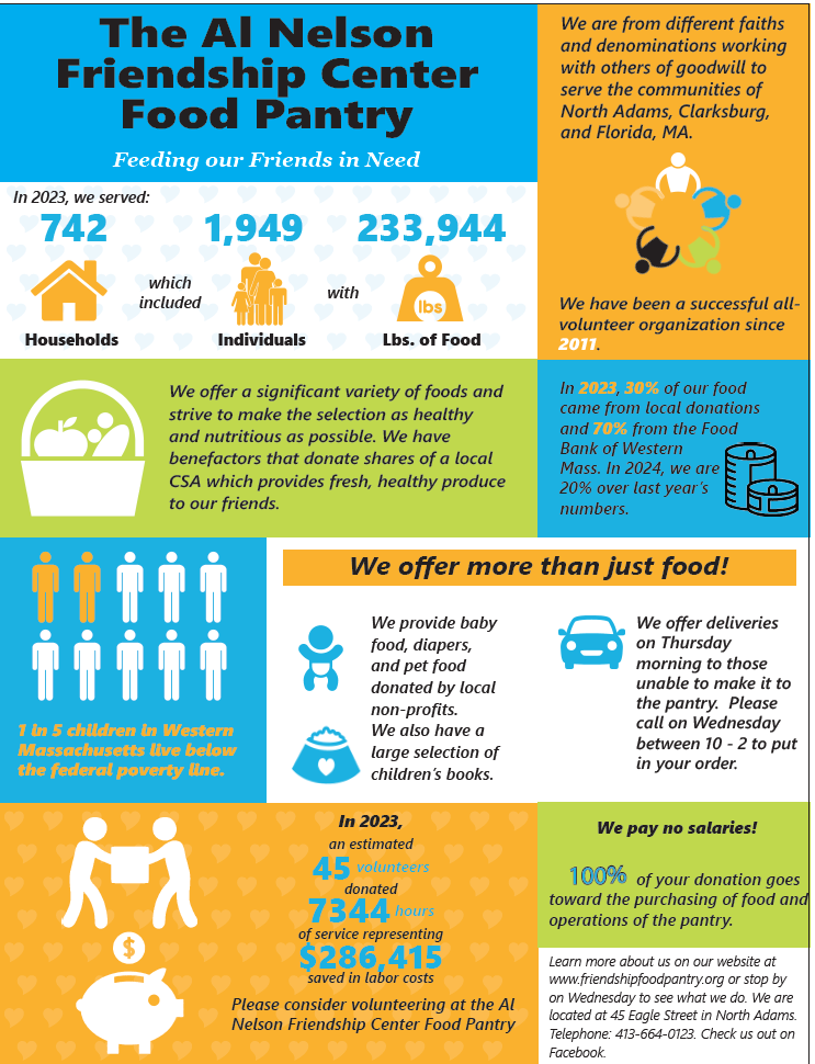 Located at 45 Eagle St. in North Adams, the Friendship Center Food Pantry welcomes support from anyone able to help. To volunteer or donate, please call 413-664-0123.