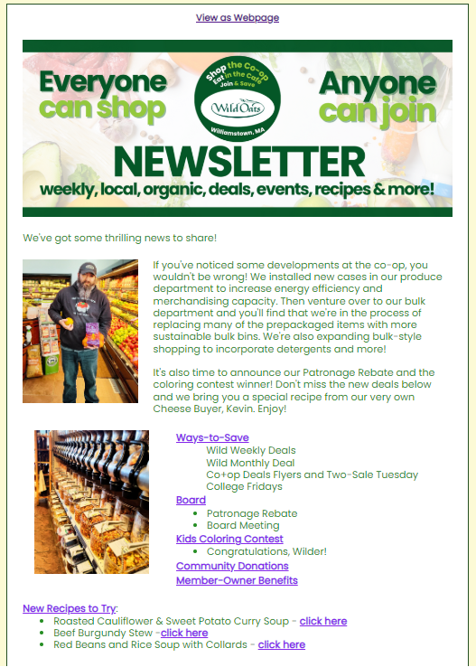 It's also time to announce our Patronage Rebate and the coloring contest winner! Don't miss the new deals below and we bring you a special recipe from our very own Cheese Buyer, Kevin. Enjoy! Come Shop The Co-op Open Daily 8 AM - 8 PM